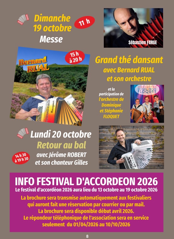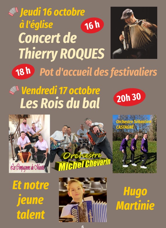 - Samedi 18/10 : Gala dansant " Tour de France de l'accordéon"de 14h30 à 1h, avec Sébastien FARGE, Etienne DENORMANDIE, Benoît NORTIER, Daniel & Vincent GAVINET, Hélène THERY, Mélodie & Franck VILAN, Christophe ANDRIEUX, Cédric BERGOUGNIOUX, Amandine MUSICHINI...