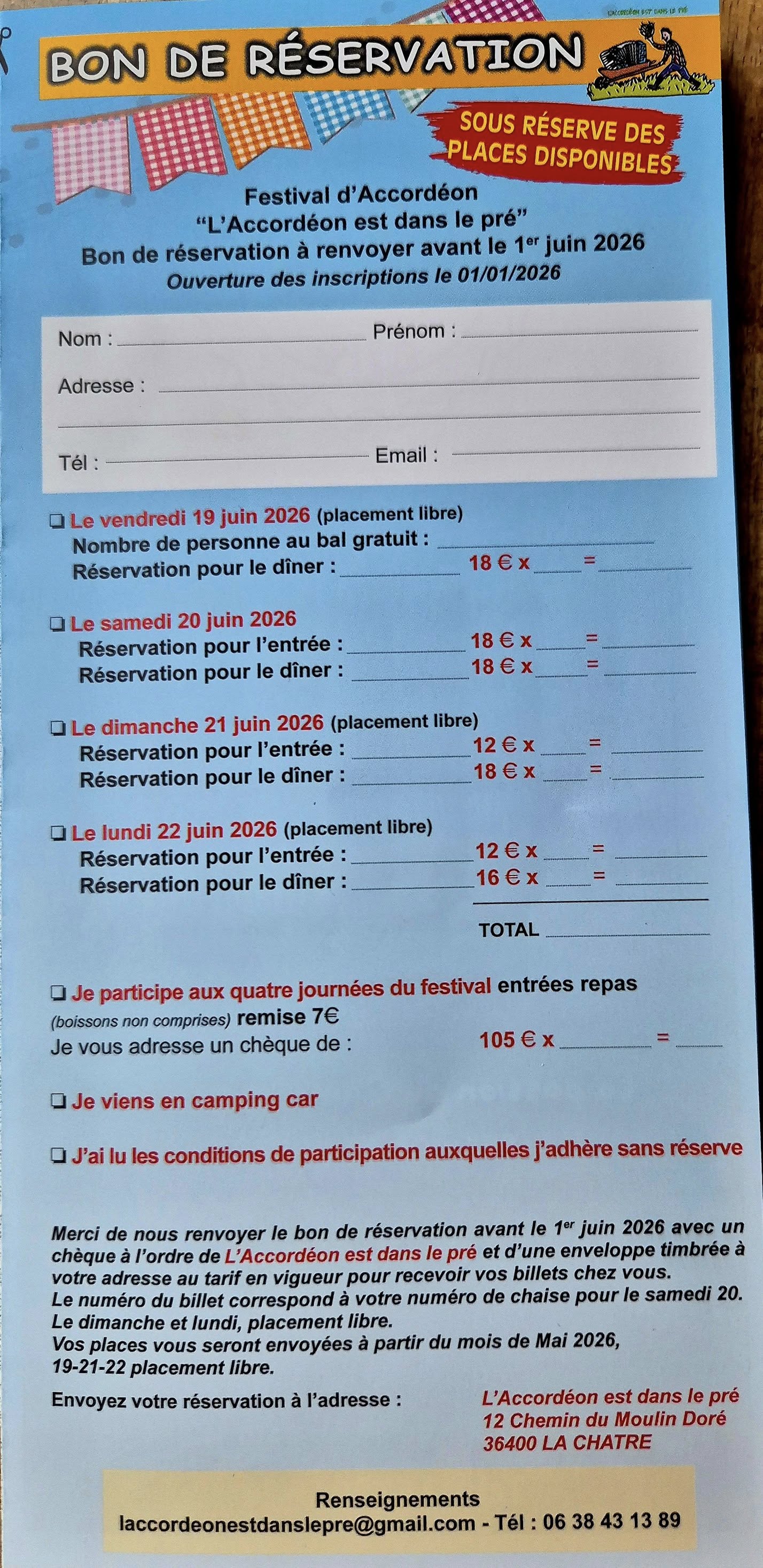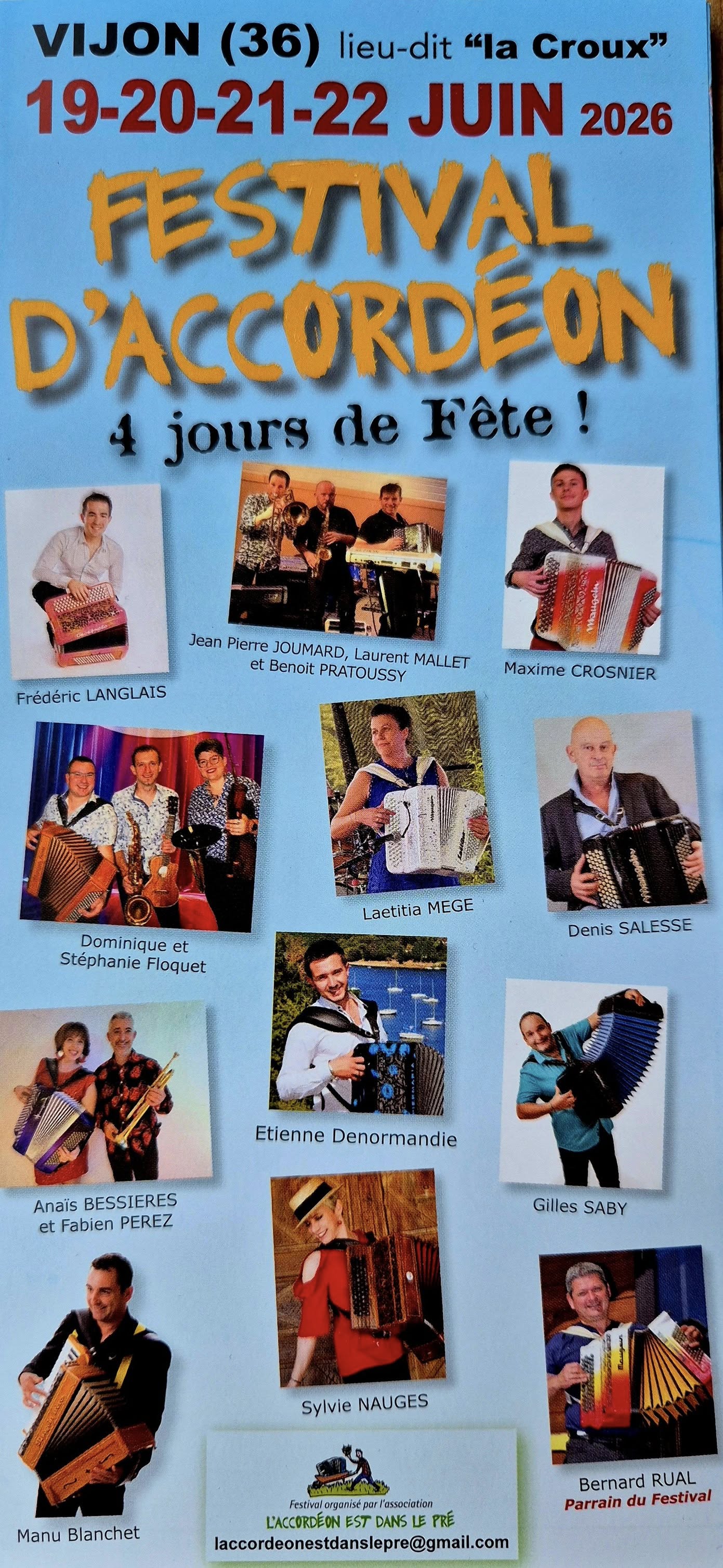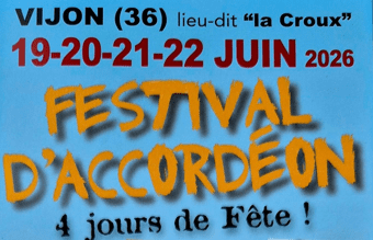 L'Association "L'Accordéon est dans le pré" organise son traditionnel Festival d'accordéon à Vijon (36) les 19,20,21 et 22 juin 2026.